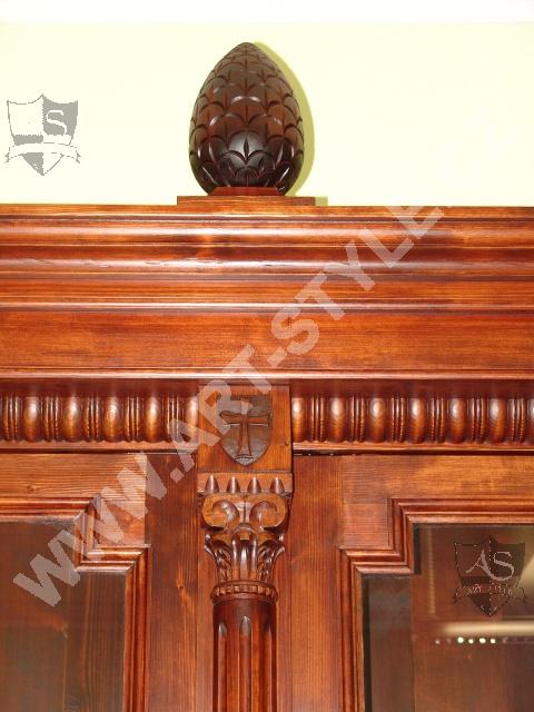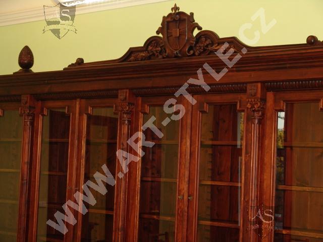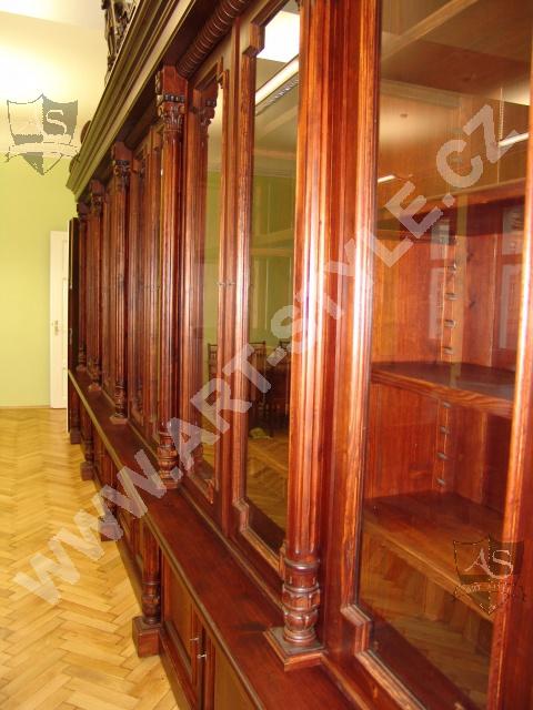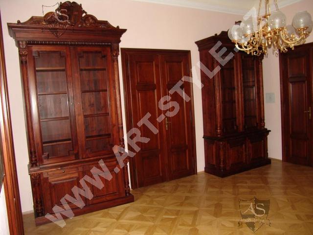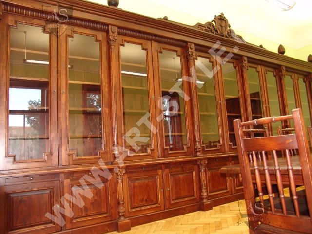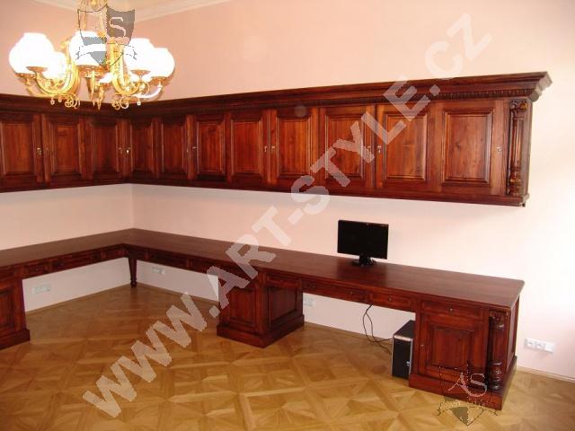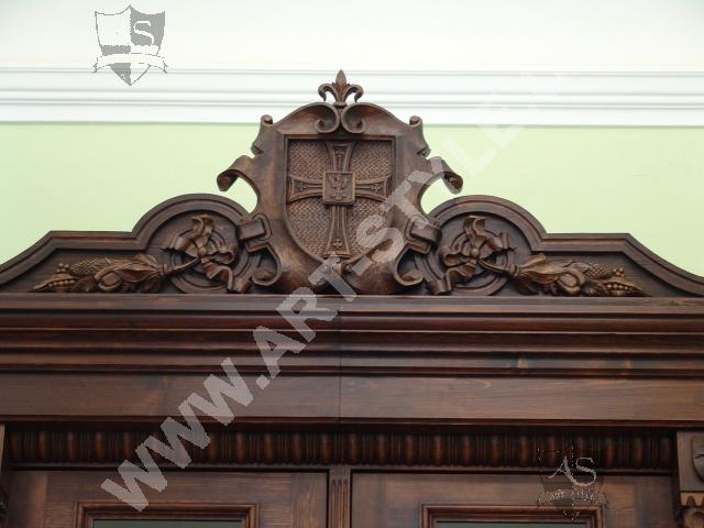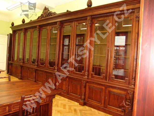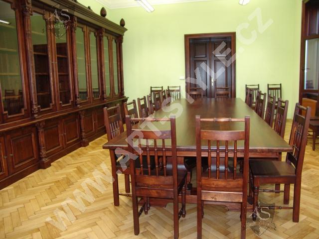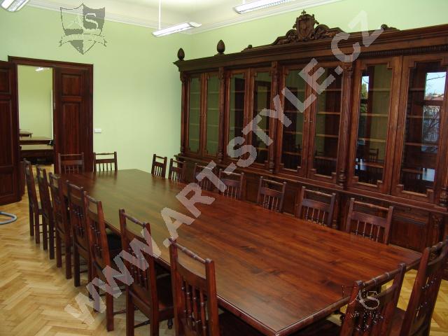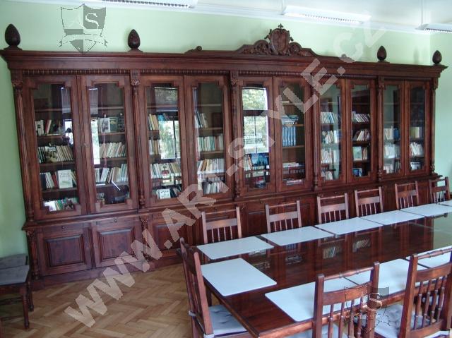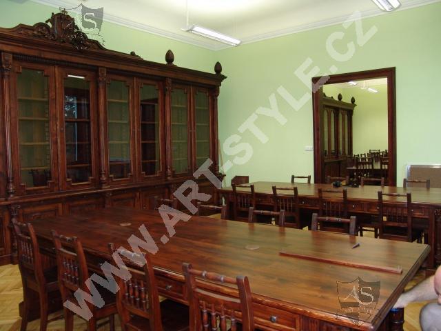 The Religious Grammar School of German Order in Olomouc (Czech Republic) commissioned Art-Style Co. to undertake one of the most demanding and sophisticated of projects, completed in two phases. We produced two magnificent bookcases and hand carved coats of arms for both of them, a table for 18 persons with dimensions of 3.6 m length by 1.6 m width, and chairs according to a given pattern. The interior further required 3 large tables for PC stations, each for 8 students. In the second phase, two other libraries in the administrative area were fitted with large desks, which also had upper cabinets attached to the wall. All were made of spruce wood with a lacquered finish.